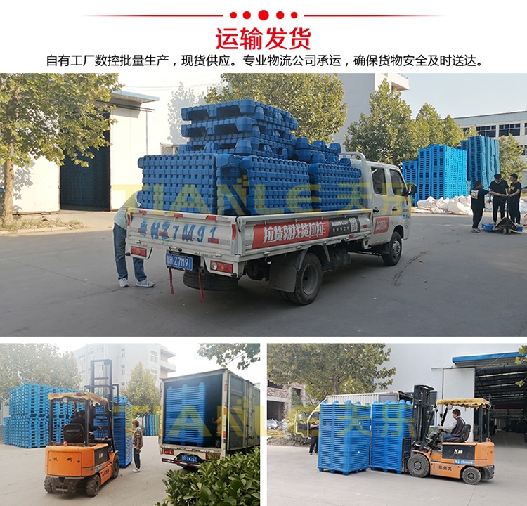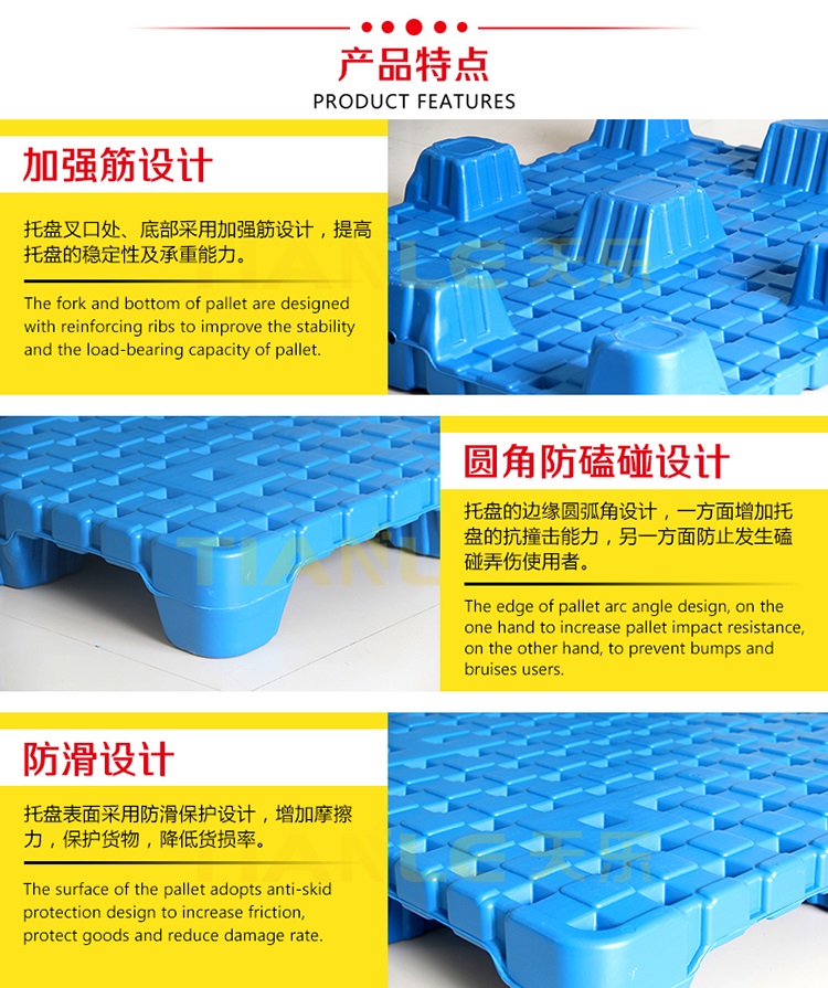【防滑設計】托盤貨叉接觸面及托盤表面均有防滑設計,增加托盤與貨物的摩擦力。